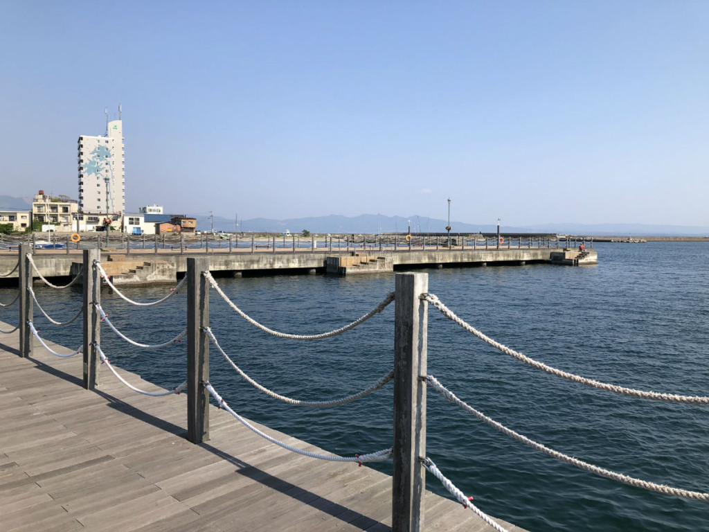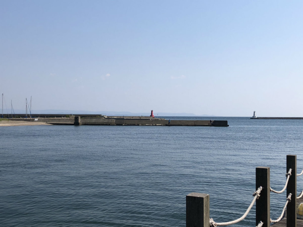 かんたん港園と言えば、やはり海の景観です。遠くにはきれいな水平線が広がっています。また、左の方に堤防も見えますが、そこではよく釣りをしている人たちも見かけます。